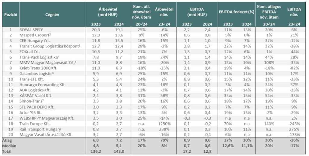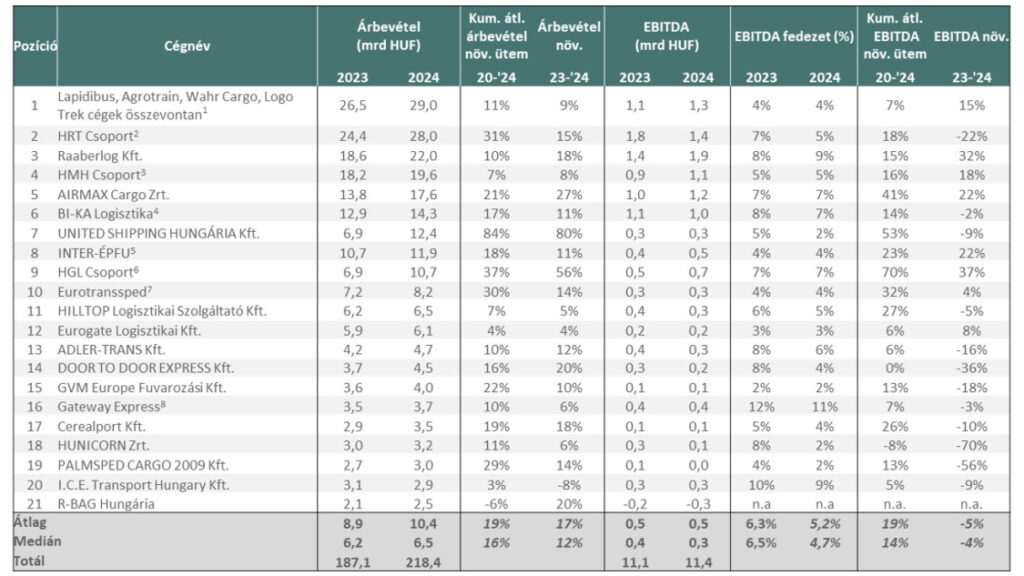 Az előző év gyenge eredményei után 202r4-ben a szállítmányozók újra növekedni tudtak. A belföldi áruforgalom volumenének jelentős csökkenése és a külkereskedelmi forgalom visszaesése ellenére az általunk vizsgált cégek mediánértéken 12%-kal növelni tudták bevételeiket 2024-ben, a lista 21 cégéből 20 ért el forgalomnövekedést.